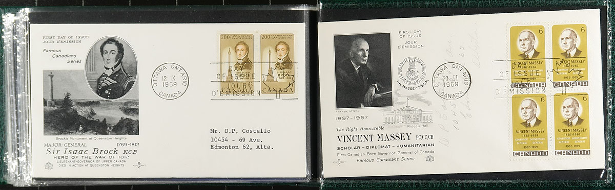 First Day Covers. Remarkable holding of about 900, mostly different, private First Day cover cachets in albums and piles, desperately needing sorting and discovery. From 1948 to about 1985 with about a dozen different cachet makers represented. The 1960’s to 1970’s is often Rosecraft, but we noted about 50 long "Schering" FDCs. The strength is about a 10-year run each of "NR" and "Fleetwood" cachets. The "NR" covers are a bit primitive and were produced in relatively small quantities and we rarely see such a complete offering. Fleetwood covers are much more sophisticated but were very pricey (e.g. the 1983 Canada Day series of 12 covers cost US$30.00!). Great for the researcher or for the collector who wants to fill in what they couldn’t afford 40 years ago! Estimate =