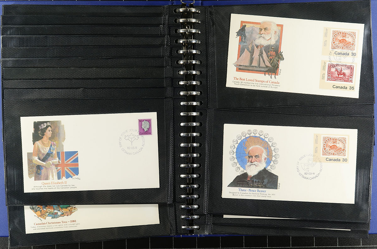 First Day Covers. Remarkable holding of about 900, mostly different, private First Day cover cachets in albums and piles, desperately needing sorting and discovery. From 1948 to about 1985 with about a dozen different cachet makers represented. The 1960’s to 1970’s is often Rosecraft, but we noted about 50 long "Schering" FDCs. The strength is about a 10-year run each of "NR" and "Fleetwood" cachets. The "NR" covers are a bit primitive and were produced in relatively small quantities and we rarely see such a complete offering. Fleetwood covers are much more sophisticated but were very pricey (e.g. the 1983 Canada Day series of 12 covers cost US$30.00!). Great for the researcher or for the collector who wants to fill in what they couldn’t afford 40 years ago! Estimate =