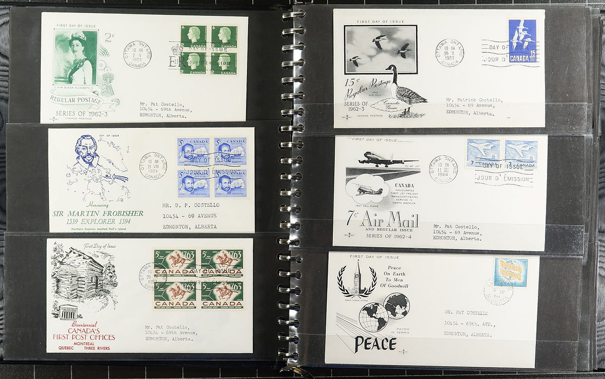 First Day Covers. Remarkable holding of about 900, mostly different, private First Day cover cachets in albums and piles, desperately needing sorting and discovery. From 1948 to about 1985 with about a dozen different cachet makers represented. The 1960’s to 1970’s is often Rosecraft, but we noted about 50 long "Schering" FDCs. The strength is about a 10-year run each of "NR" and "Fleetwood" cachets. The "NR" covers are a bit primitive and were produced in relatively small quantities and we rarely see such a complete offering. Fleetwood covers are much more sophisticated but were very pricey (e.g. the 1983 Canada Day series of 12 covers cost US$30.00!). Great for the researcher or for the collector who wants to fill in what they couldn’t afford 40 years ago! Estimate =