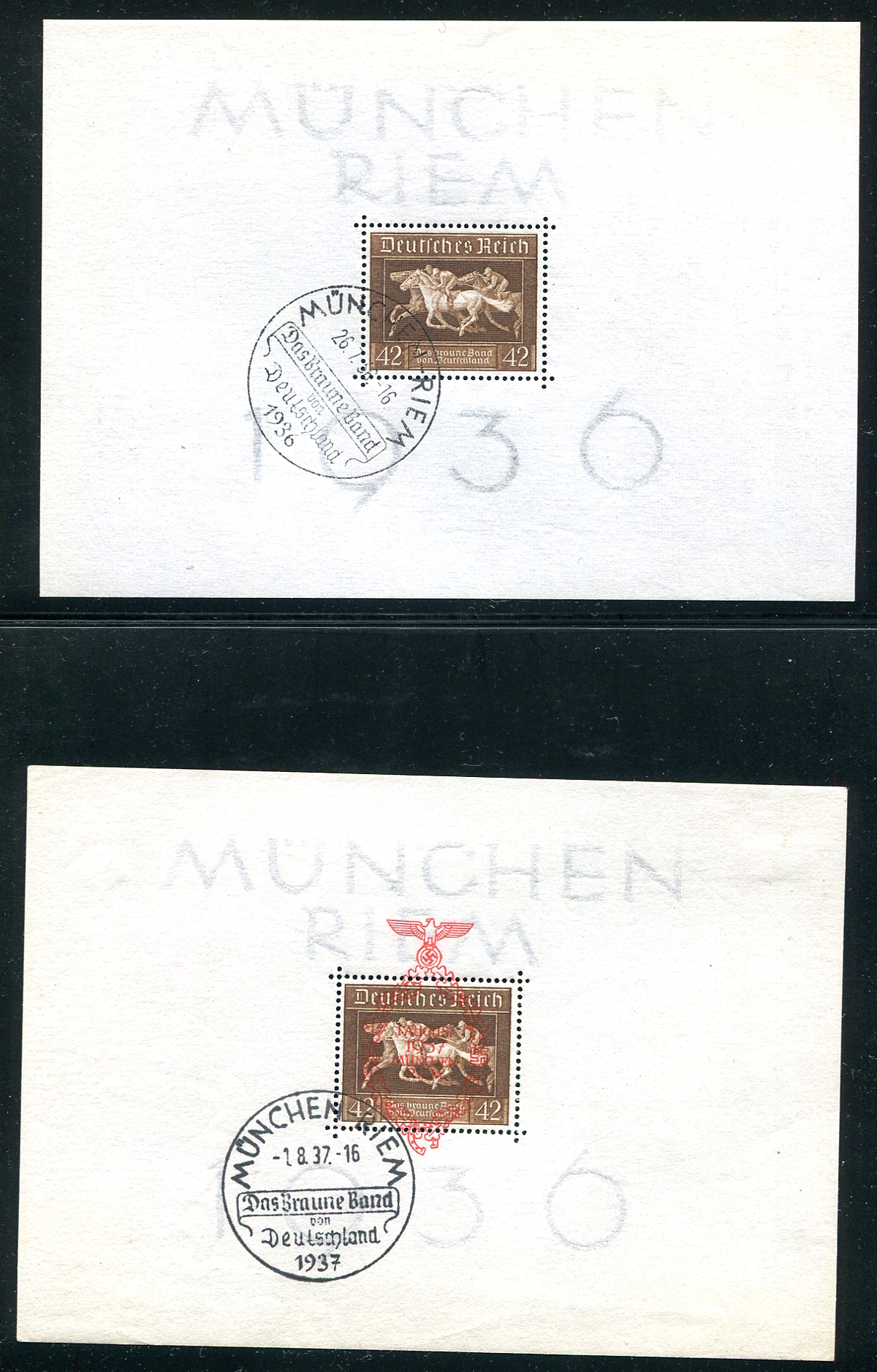 Octet of used Third Reich era souvenir sheets including the Horse Race (plus the Brown Ribbon overprint), the 1936 Berlin summer Olympics duo and four featuring Adolf Hitler. All have contemporary commemorative cancels. A couple with original gum, one of the Hitler sheets with a tiny nick in the upper right corner, otherwise far better than normally seen of this type, which is prone to wrinkling and edge damage. 2024 Scott US$415.50 =