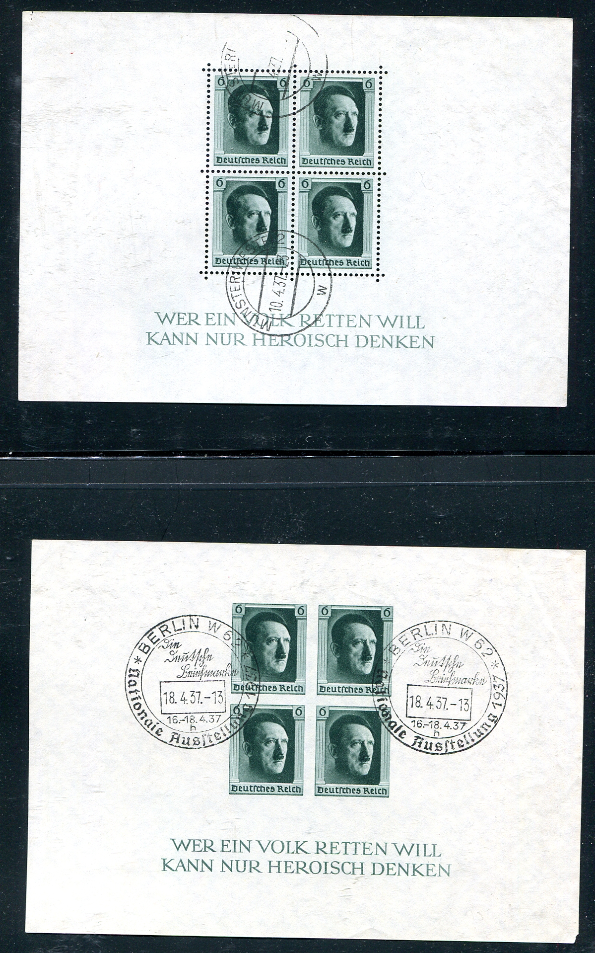 Octet of used Third Reich era souvenir sheets including the Horse Race (plus the Brown Ribbon overprint), the 1936 Berlin summer Olympics duo and four featuring Adolf Hitler. All have contemporary commemorative cancels. A couple with original gum, one of the Hitler sheets with a tiny nick in the upper right corner, otherwise far better than normally seen of this type, which is prone to wrinkling and edge damage. 2024 Scott US$415.50 =
