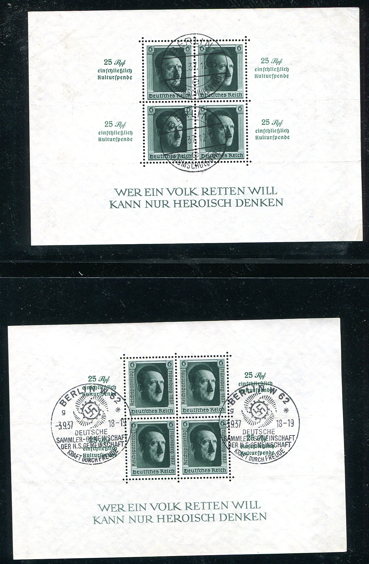 Octet of used Third Reich era souvenir sheets including the Horse Race (plus the Brown Ribbon overprint), the 1936 Berlin summer Olympics duo and four featuring Adolf Hitler. All have contemporary commemorative cancels. A couple with original gum, one of the Hitler sheets with a tiny nick in the upper right corner, otherwise far better than normally seen of this type, which is prone to wrinkling and edge damage. 2024 Scott US$415.50 =