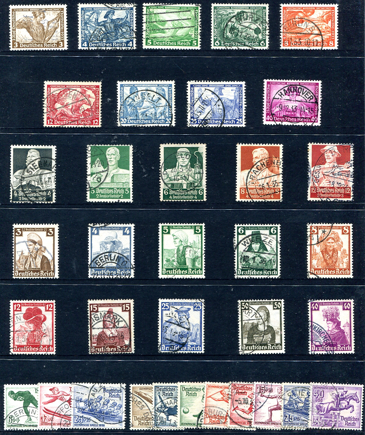 Most of the early semi-postal issues postally used from the Third Reich era, running from the 1933 set (the 20pf is the second perf #B56a) up to the end of the 1936 Berlin summer Olympics issues. A lovely selection. 2024 Scott US$379.10 =