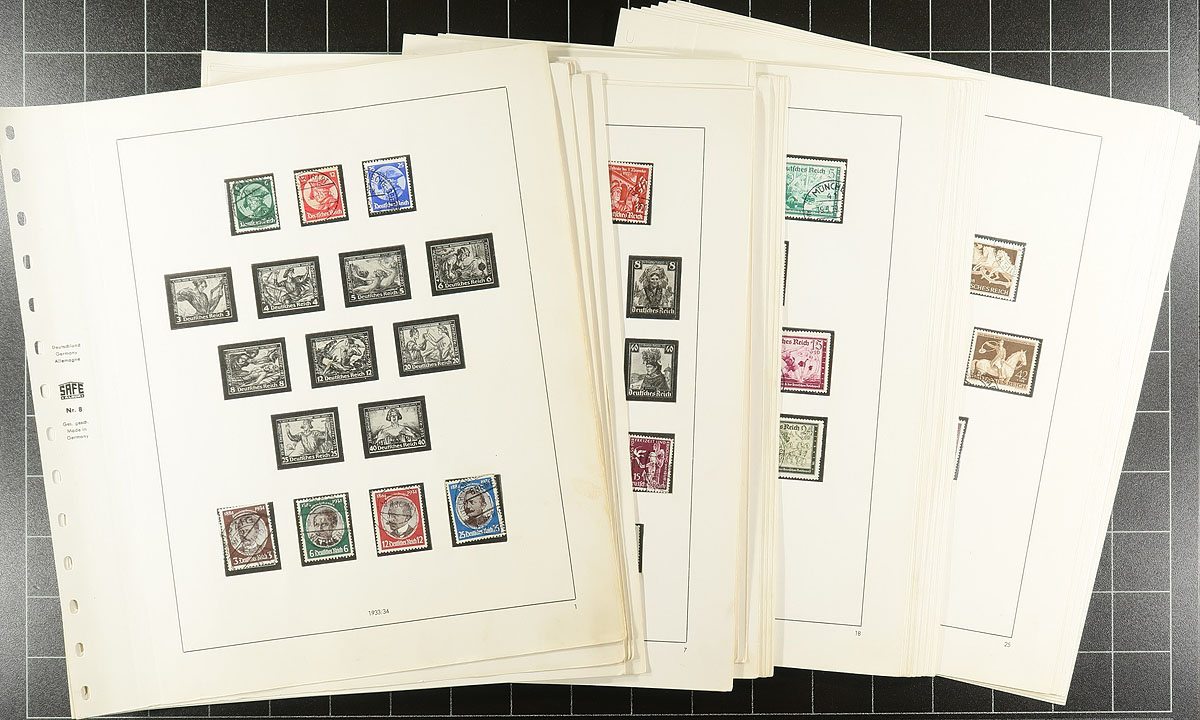 Near complete collection of used single regular issue and semi-postal stamps of the Third Reich era on older 14-ring SAFE hingeless pages (reference NR.13). From an era where used is often harder to obtain than mint examples, this is a lovely offering, mostly having clean, readable cancels. 2024 Scott US$683.85 =