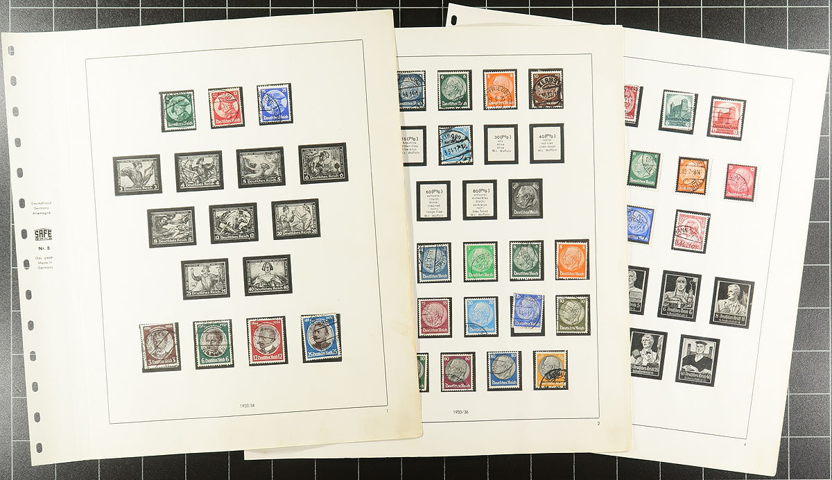 Near complete collection of used single regular issue and semi-postal stamps of the Third Reich era on older 14-ring SAFE hingeless pages (reference NR.13). From an era where used is often harder to obtain than mint examples, this is a lovely offering, mostly having clean, readable cancels. 2024 Scott US$683.85 =
