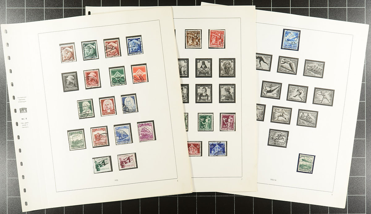 Near complete collection of used single regular issue and semi-postal stamps of the Third Reich era on older 14-ring SAFE hingeless pages (reference NR.13). From an era where used is often harder to obtain than mint examples, this is a lovely offering, mostly having clean, readable cancels. 2024 Scott US$683.85 =