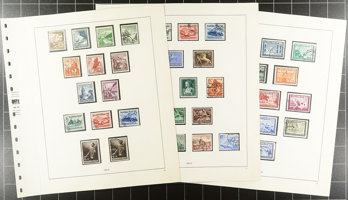 Near complete collection of used single regular issue and semi-postal stamps of the Third Reich era on older 14-ring SAFE hingeless pages (reference NR.13). From an era where used is often harder to obtain than mint examples, this is a lovely offering, mostly having clean, readable cancels. 2024 Scott US$683.85 =
