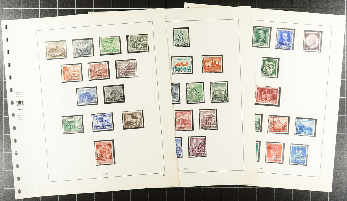 Near complete collection of used single regular issue and semi-postal stamps of the Third Reich era on older 14-ring SAFE hingeless pages (reference NR.13). From an era where used is often harder to obtain than mint examples, this is a lovely offering, mostly having clean, readable cancels. 2024 Scott US$683.85 =