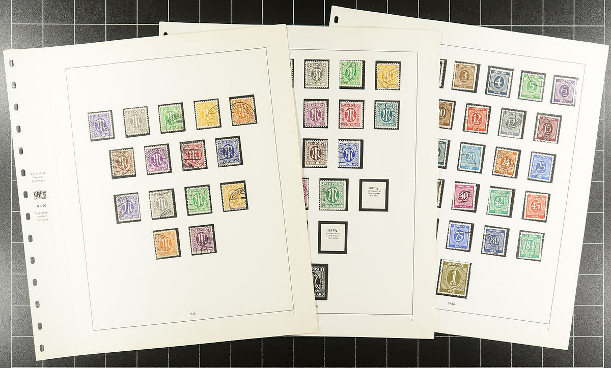 An attractive collection of used post-WWII Germany up to the creation of the German Federation in 1949. Includes some Allied Military Government issues, overprints on definitives, the "Castles" set and most of the secondary perforation changes, plus most of the semi-postals (this being the highlight of the lot). All housed on older 14-ring SAFE hingeless pages (reference NR.10). Difficult to find used examples of many stamps from this chaotic period of history, and only one stamp is obviously faulty and not counted in the total catalogue value. 2024 Scott US$436.45 =