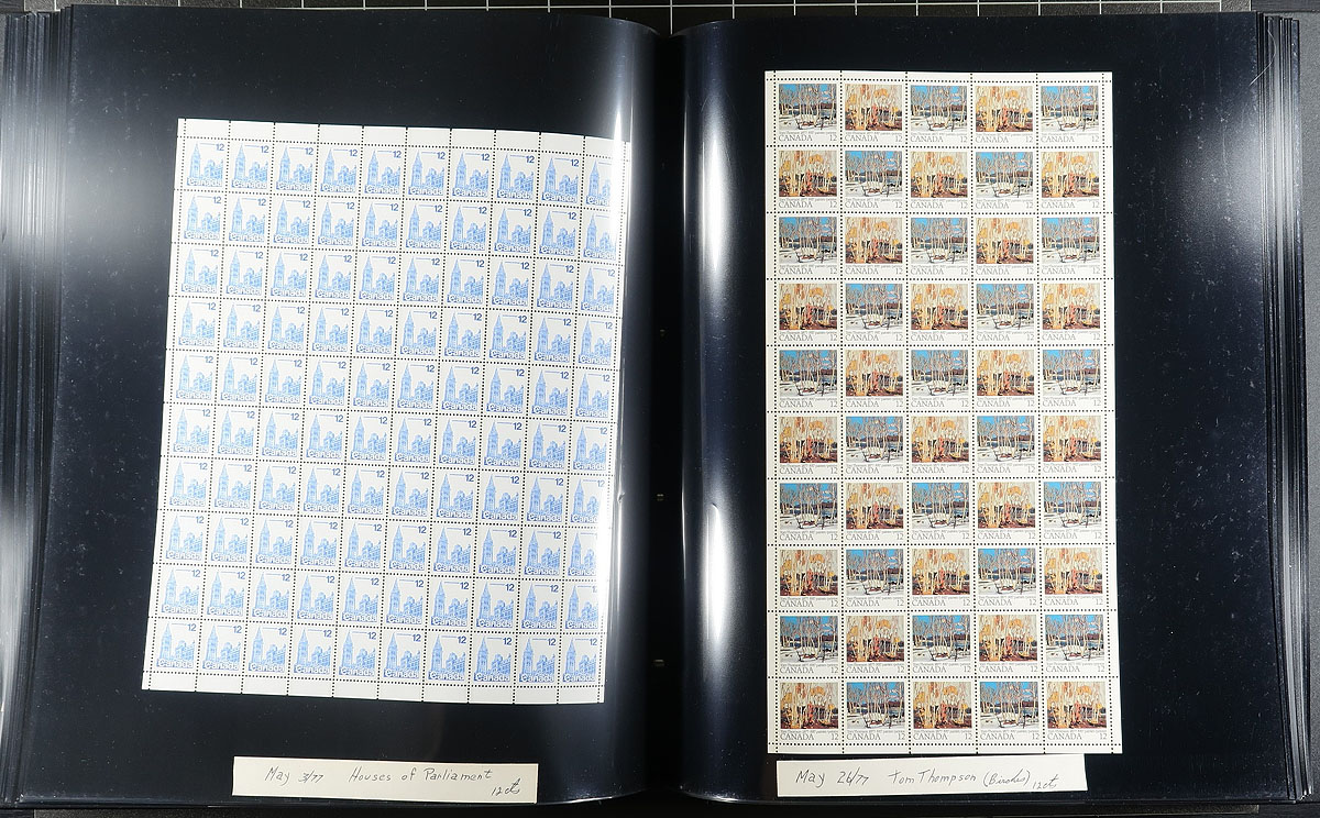 Mint Sheet Holding #586/769. Complete mint field-stock sheets (no plate blocks) in as-new condition covering almost seven years of issue, including commemoratives, definitives and semi-postals (no premium for surcharge). Includes Caricatures to 8c, "Streets" to 80c, a Fundy dollar and the complete Capex ’78 set, plus the Olympic semi-postals. The $1 and $2 Olympic architecture are sheetlets of 8, otherwise everything else is in a pane of 50 or 100 stamps, all mint never hinged. The bonus is that they are housed in a like new condition black, cover and page, Uni-Safe mint sheet file binder with matching slip cover, which seems to be out of production, but likely would sell for over $100.00. Conservatively valued for the total face value only (but full sheets often demand a premium). Total face value =
