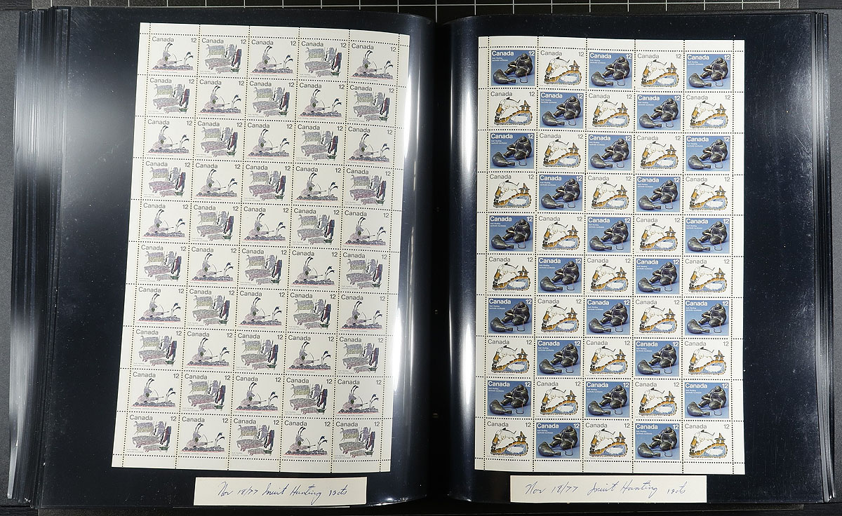 Mint Sheet Holding #586/769. Complete mint field-stock sheets (no plate blocks) in as-new condition covering almost seven years of issue, including commemoratives, definitives and semi-postals (no premium for surcharge). Includes Caricatures to 8c, "Streets" to 80c, a Fundy dollar and the complete Capex ’78 set, plus the Olympic semi-postals. The $1 and $2 Olympic architecture are sheetlets of 8, otherwise everything else is in a pane of 50 or 100 stamps, all mint never hinged. The bonus is that they are housed in a like new condition black, cover and page, Uni-Safe mint sheet file binder with matching slip cover, which seems to be out of production, but likely would sell for over $100.00. Conservatively valued for the total face value only (but full sheets often demand a premium). Total face value =