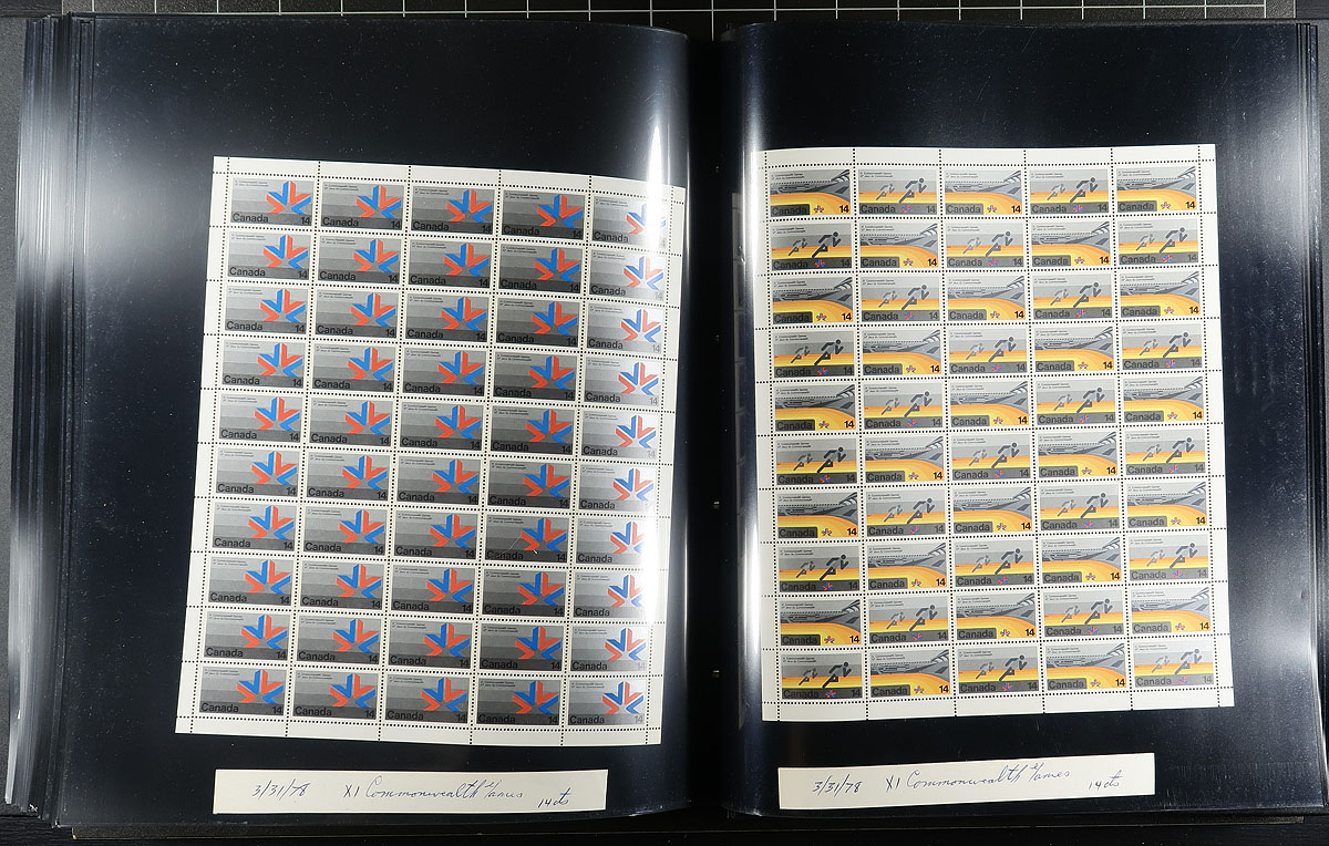 Mint Sheet Holding #586/769. Complete mint field-stock sheets (no plate blocks) in as-new condition covering almost seven years of issue, including commemoratives, definitives and semi-postals (no premium for surcharge). Includes Caricatures to 8c, "Streets" to 80c, a Fundy dollar and the complete Capex ’78 set, plus the Olympic semi-postals. The $1 and $2 Olympic architecture are sheetlets of 8, otherwise everything else is in a pane of 50 or 100 stamps, all mint never hinged. The bonus is that they are housed in a like new condition black, cover and page, Uni-Safe mint sheet file binder with matching slip cover, which seems to be out of production, but likely would sell for over $100.00. Conservatively valued for the total face value only (but full sheets often demand a premium). Total face value =