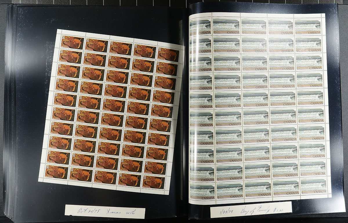 Mint Sheet Holding #586/769. Complete mint field-stock sheets (no plate blocks) in as-new condition covering almost seven years of issue, including commemoratives, definitives and semi-postals (no premium for surcharge). Includes Caricatures to 8c, "Streets" to 80c, a Fundy dollar and the complete Capex ’78 set, plus the Olympic semi-postals. The $1 and $2 Olympic architecture are sheetlets of 8, otherwise everything else is in a pane of 50 or 100 stamps, all mint never hinged. The bonus is that they are housed in a like new condition black, cover and page, Uni-Safe mint sheet file binder with matching slip cover, which seems to be out of production, but likely would sell for over $100.00. Conservatively valued for the total face value only (but full sheets often demand a premium). Total face value =