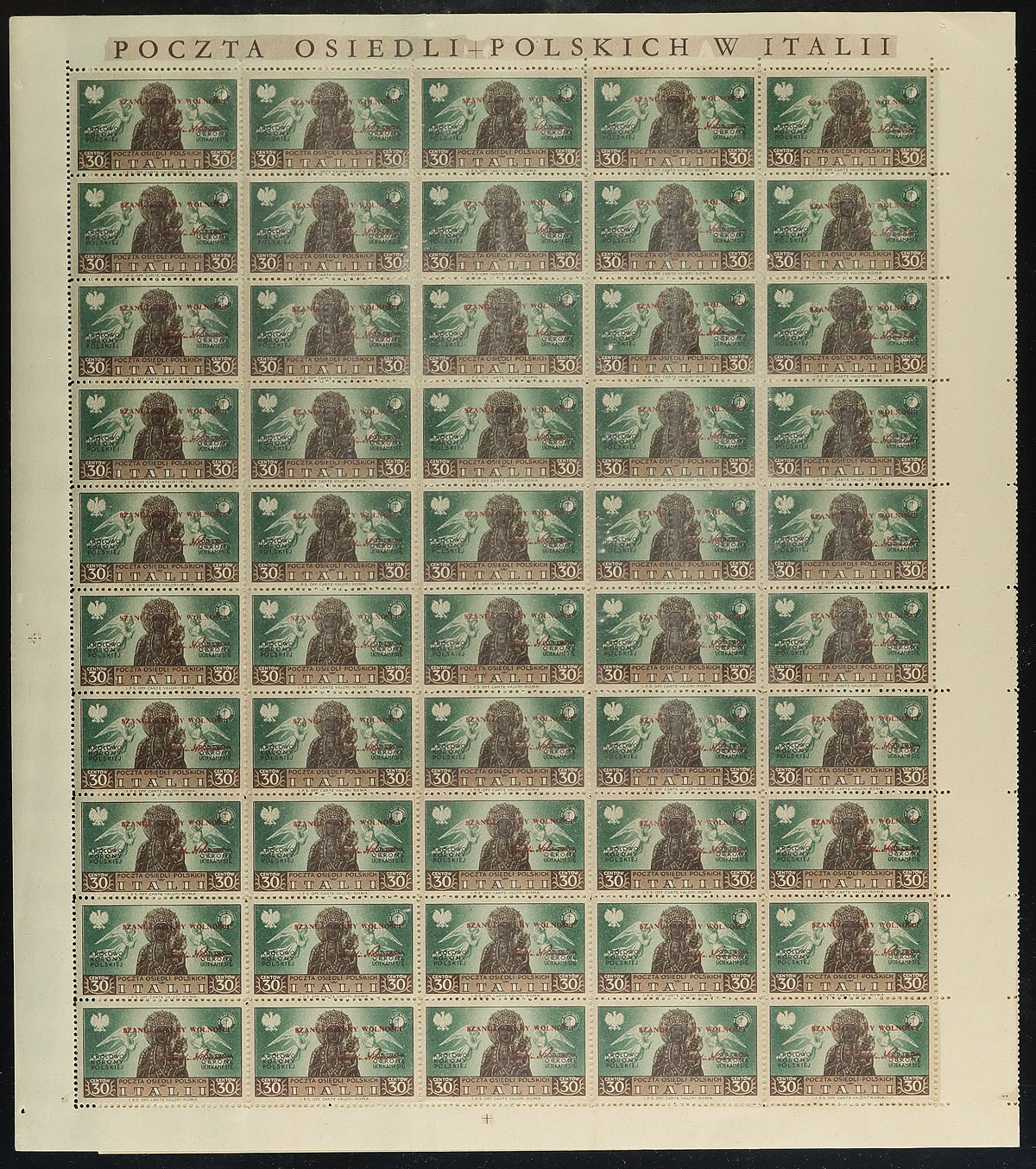 During the Second World War a group of Polish exiles fought under the British Army in Italy. A series of stamps were issued as "Polish Forces in Italy". They are listed in Sassone but Scott treats them as non-official or "Cinderella" stamps. Towards the end of the war, several of the stamps were overprinted in honour of US President Franklin Roosevelt and his vision of "Four Freedoms". This lot consists of five denominations, each overprinted, in complete gutter panes of 50 stamps each (100 stamps in total - the sheets are of a substantial size and are folded in mint sheet file pages). A couple have some minor gum disturbance, otherwise they are about as nice as you are likely to find. Estimate =