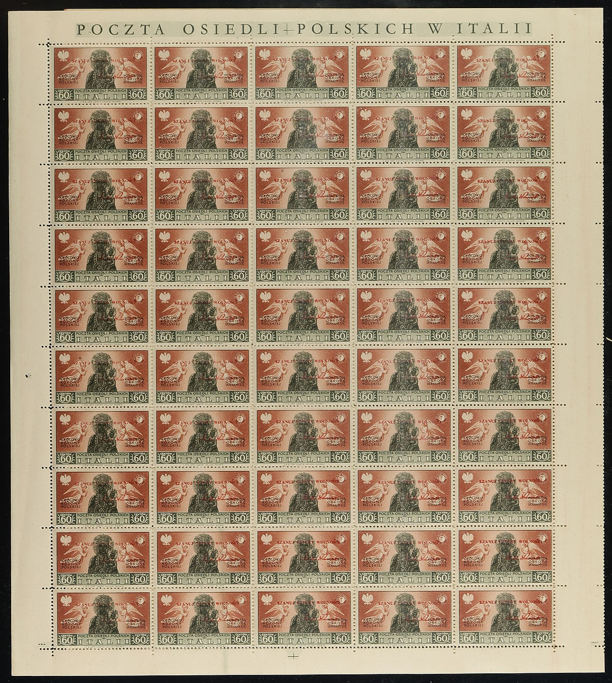 During the Second World War a group of Polish exiles fought under the British Army in Italy. A series of stamps were issued as "Polish Forces in Italy". They are listed in Sassone but Scott treats them as non-official or "Cinderella" stamps. Towards the end of the war, several of the stamps were overprinted in honour of US President Franklin Roosevelt and his vision of "Four Freedoms". This lot consists of five denominations, each overprinted, in complete gutter panes of 50 stamps each (100 stamps in total - the sheets are of a substantial size and are folded in mint sheet file pages). A couple have some minor gum disturbance, otherwise they are about as nice as you are likely to find. Estimate =