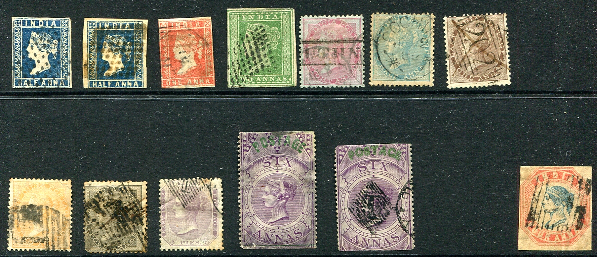 A dozen different used early India all depicting Queen Victoria. Starts with a trio from the first General Issue and the 2a green #5. There is a jump to the blue and white paper issues of the 1850’s and then both types of the green overprint on the revenue stamp modified for postal use (#29 and #30). Nice appearance, with some minor faults to be expected. To spice things up, an attractive forgery of #6 is included but not counted in the catalogue value. 2024 Scott US$732.50 =