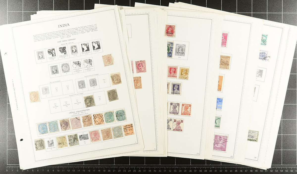 Mostly used mounted collection on Minkus pages to 1972, with a solid offering of Queen Victoria (with denominations to 5r) including Official and CEF overprints. The Edward VII includes values to 15r (with a nice mint copy of #73, cat $100.00) and officials to 10r. The King George V section is equally thorough, with regular issues to 25r and officials to 10r (noted a few individual stamps cataloguing $40-$50 each). The 1931 New Delhi issue is complete, used. The regular issues are nearly complete to 1972 (no high value Gandhi). The collector has also added a few duplicates, many of which is unclear why, so there could be some exploring for the specialist. Several hundred different stamps here. Estimate =