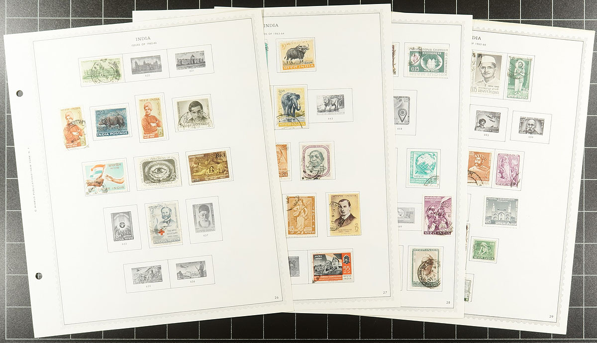 Mostly used mounted collection on Minkus pages to 1972, with a solid offering of Queen Victoria (with denominations to 5r) including Official and CEF overprints. The Edward VII includes values to 15r (with a nice mint copy of #73, cat $100.00) and officials to 10r. The King George V section is equally thorough, with regular issues to 25r and officials to 10r (noted a few individual stamps cataloguing $40-$50 each). The 1931 New Delhi issue is complete, used. The regular issues are nearly complete to 1972 (no high value Gandhi). The collector has also added a few duplicates, many of which is unclear why, so there could be some exploring for the specialist. Several hundred different stamps here. Estimate =