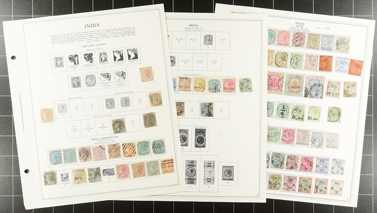Mostly used mounted collection on Minkus pages to 1972, with a solid offering of Queen Victoria (with denominations to 5r) including Official and CEF overprints. The Edward VII includes values to 15r (with a nice mint copy of #73, cat $100.00) and officials to 10r. The King George V section is equally thorough, with regular issues to 25r and officials to 10r (noted a few individual stamps cataloguing $40-$50 each). The 1931 New Delhi issue is complete, used. The regular issues are nearly complete to 1972 (no high value Gandhi). The collector has also added a few duplicates, many of which is unclear why, so there could be some exploring for the specialist. Several hundred different stamps here. Estimate =