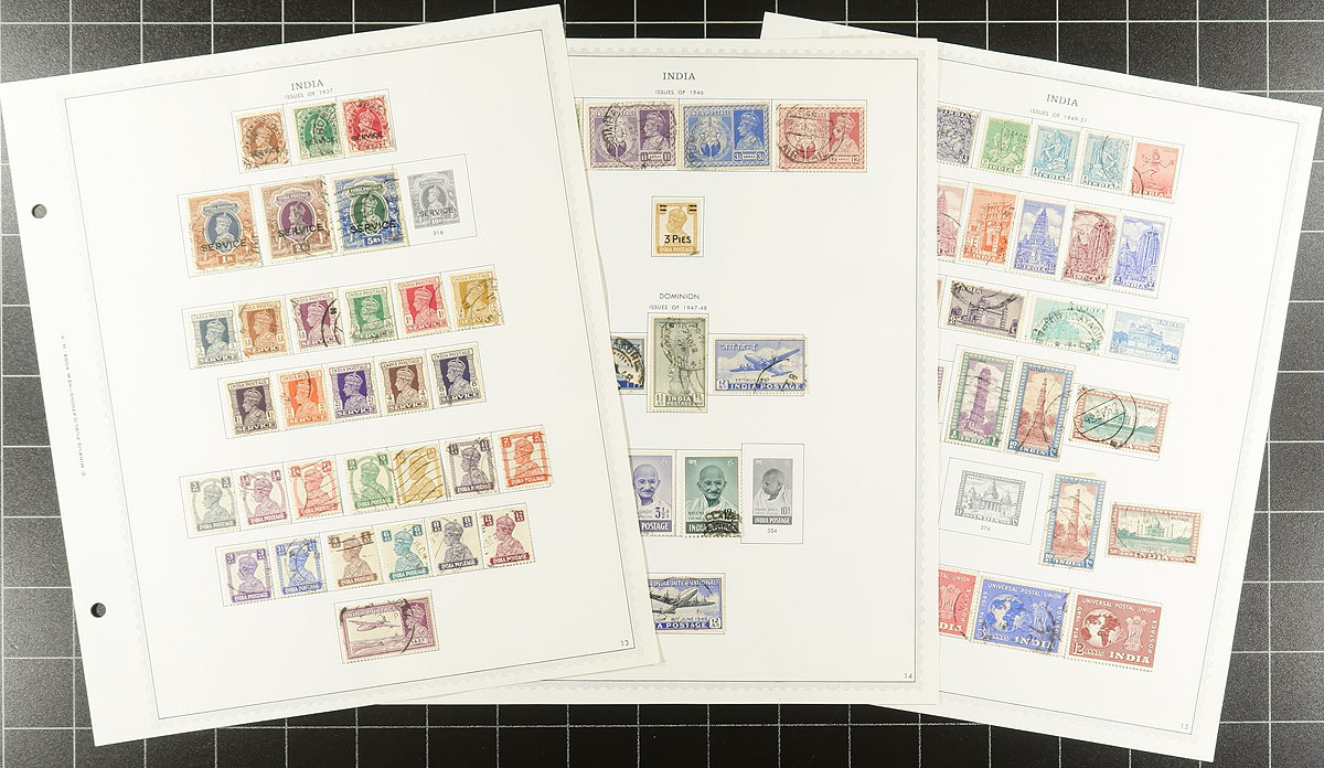 Mostly used mounted collection on Minkus pages to 1972, with a solid offering of Queen Victoria (with denominations to 5r) including Official and CEF overprints. The Edward VII includes values to 15r (with a nice mint copy of #73, cat $100.00) and officials to 10r. The King George V section is equally thorough, with regular issues to 25r and officials to 10r (noted a few individual stamps cataloguing $40-$50 each). The 1931 New Delhi issue is complete, used. The regular issues are nearly complete to 1972 (no high value Gandhi). The collector has also added a few duplicates, many of which is unclear why, so there could be some exploring for the specialist. Several hundred different stamps here. Estimate =
