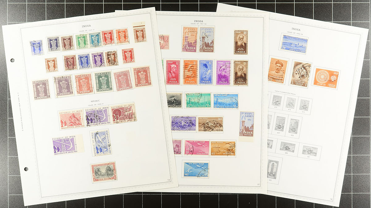 Mostly used mounted collection on Minkus pages to 1972, with a solid offering of Queen Victoria (with denominations to 5r) including Official and CEF overprints. The Edward VII includes values to 15r (with a nice mint copy of #73, cat $100.00) and officials to 10r. The King George V section is equally thorough, with regular issues to 25r and officials to 10r (noted a few individual stamps cataloguing $40-$50 each). The 1931 New Delhi issue is complete, used. The regular issues are nearly complete to 1972 (no high value Gandhi). The collector has also added a few duplicates, many of which is unclear why, so there could be some exploring for the specialist. Several hundred different stamps here. Estimate =