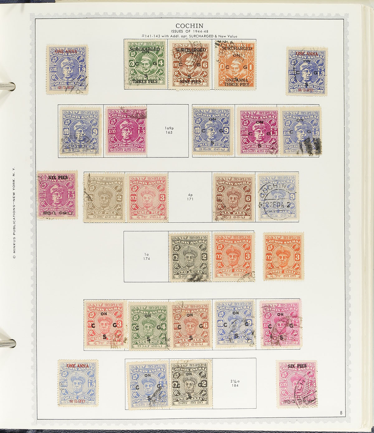 We don’t often see collections with this many Convention and Feudatory states represented, and this lot is a collector’s dream with a wide breadth of material, mixed in with some dubious items to keep you on your toes. From 1 stamp to 50 from each state, such as: Alwar, Barwini, Bhopal, Bundi, Bussahir, Chamba, Charkari, Cochin, Dhar, Duttia, Faridkot, Gwalior, Hyderabad, Idar, Indore, Jaipur, Jammu and Kashmir, Jasdan, Jhind, Kishangarh, Morvi, Nabha, Nandgaon, Orchha, Pataila, Saurashtra, SIrmoor, Travancore, Travancore-Cochin, Wadhwan. Mint, (mostly) used, regular issues, lots of officials all housed on Minkus pages in an old Minkus binder (back cover is quite worn). A few hundred stamps here to keep you busy for a while. Estimate =