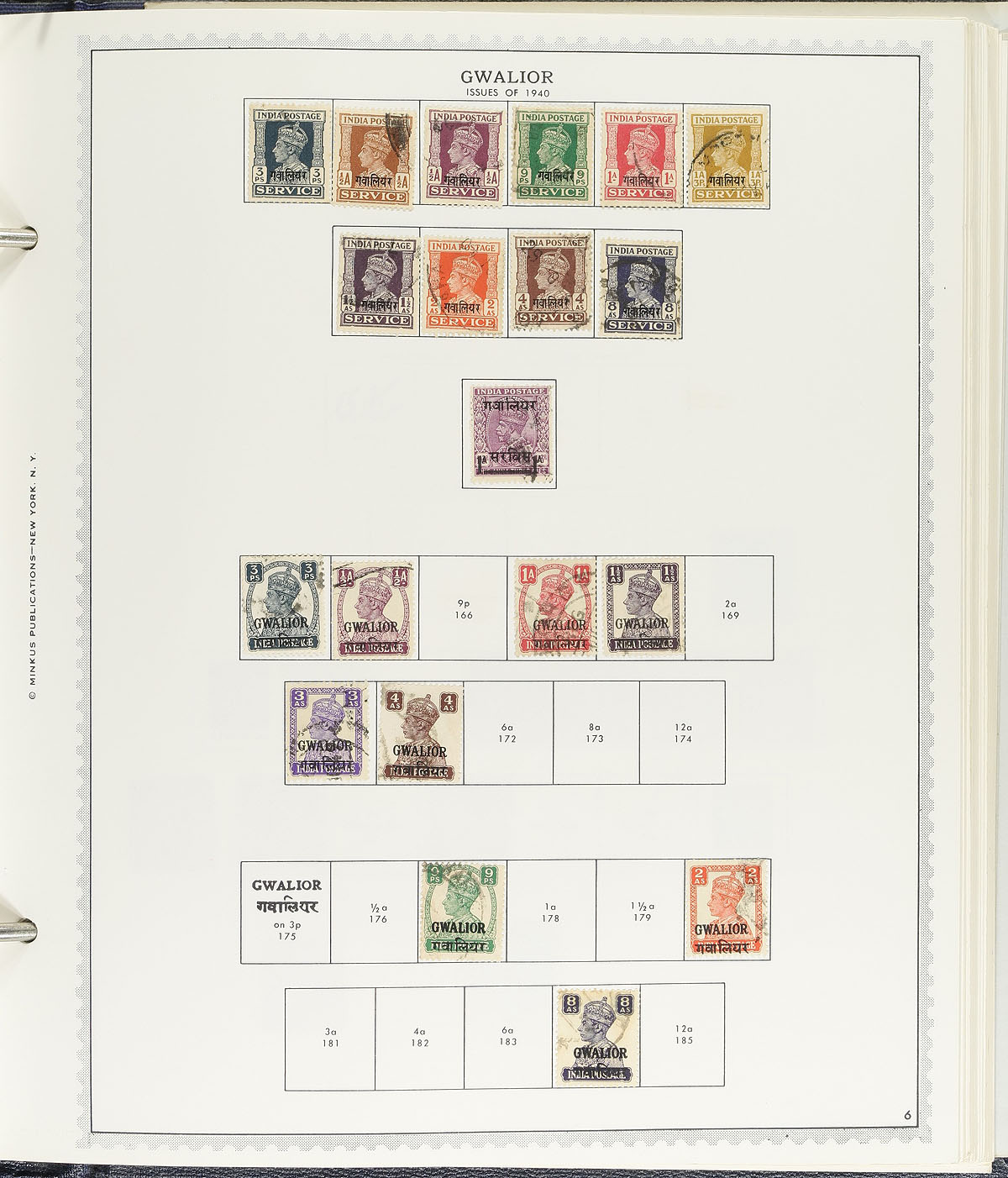 We don’t often see collections with this many Convention and Feudatory states represented, and this lot is a collector’s dream with a wide breadth of material, mixed in with some dubious items to keep you on your toes. From 1 stamp to 50 from each state, such as: Alwar, Barwini, Bhopal, Bundi, Bussahir, Chamba, Charkari, Cochin, Dhar, Duttia, Faridkot, Gwalior, Hyderabad, Idar, Indore, Jaipur, Jammu and Kashmir, Jasdan, Jhind, Kishangarh, Morvi, Nabha, Nandgaon, Orchha, Pataila, Saurashtra, SIrmoor, Travancore, Travancore-Cochin, Wadhwan. Mint, (mostly) used, regular issues, lots of officials all housed on Minkus pages in an old Minkus binder (back cover is quite worn). A few hundred stamps here to keep you busy for a while. Estimate =