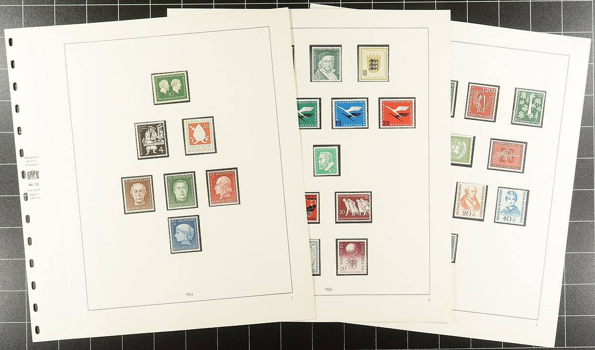 Mint, never hinged, collection of over one hundred different regular issue and semi-postal stamps all attractively mounted in old 14-ring SAFE hingeless pages to 1961 (reference: Bundesrepublik Nr.13). Missing very few stamps (almost all are from 1949-50), including stamps with individual catalogue values of $15-$50 each. Never hinged from this period is difficult to find, based on the catalogue premiums of 2x-8x the catalogue value for hinged. 2024 Scott catalogue value US$999.05 =