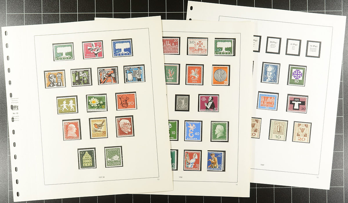 Mint, never hinged, collection of over one hundred different regular issue and semi-postal stamps all attractively mounted in old 14-ring SAFE hingeless pages to 1961 (reference: Bundesrepublik Nr.13). Missing very few stamps (almost all are from 1949-50), including stamps with individual catalogue values of $15-$50 each. Never hinged from this period is difficult to find, based on the catalogue premiums of 2x-8x the catalogue value for hinged. 2024 Scott catalogue value US$999.05 =