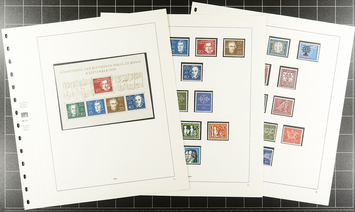 Mint, never hinged, collection of over one hundred different regular issue and semi-postal stamps all attractively mounted in old 14-ring SAFE hingeless pages to 1961 (reference: Bundesrepublik Nr.13). Missing very few stamps (almost all are from 1949-50), including stamps with individual catalogue values of $15-$50 each. Never hinged from this period is difficult to find, based on the catalogue premiums of 2x-8x the catalogue value for hinged. 2024 Scott catalogue value US$999.05 =