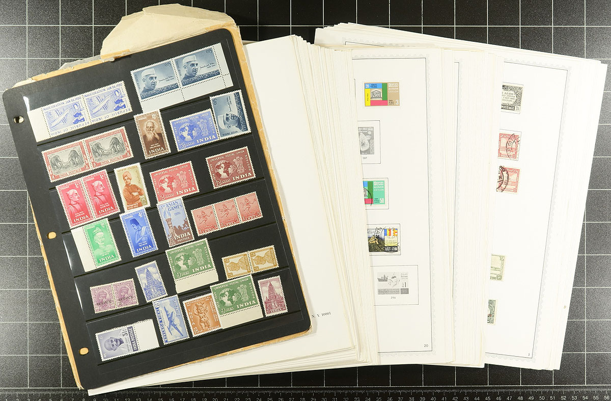 Balance of a consignment in a tin and a bundle of album pages. The tin may be the most valuable part with an assortment of mint and used issues from Queen Victoria to the 1990’s with strength in the 1940’s-1950’s (we noted 14 mint copies of Gandhi #203 and 4 of #204), with bits and pieces of definitives and "Asian Games 1951" plus more. There are old block files, approval booklets, envelopes with loose stamps, etc. There is an envelope with a folded and a bit battered sheet of #155. The album pages cover "India - adjacent" countries on Minkus pages, from Burma, Pakistan, Nepal and Ceylon - almost all pre-1970, with a few hundred mostly used stamps with individual catalog values up to $10.00. A philatelic miner’s delight. Estimate =