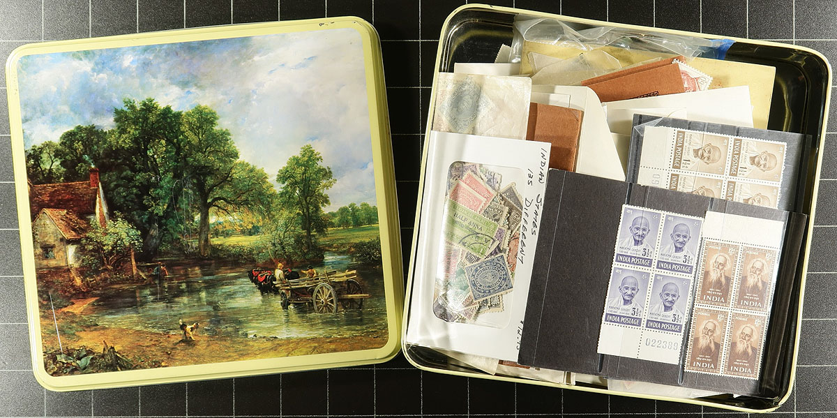 Balance of a consignment in a tin and a bundle of album pages. The tin may be the most valuable part with an assortment of mint and used issues from Queen Victoria to the 1990’s with strength in the 1940’s-1950’s (we noted 14 mint copies of Gandhi #203 and 4 of #204), with bits and pieces of definitives and "Asian Games 1951" plus more. There are old block files, approval booklets, envelopes with loose stamps, etc. There is an envelope with a folded and a bit battered sheet of #155. The album pages cover "India - adjacent" countries on Minkus pages, from Burma, Pakistan, Nepal and Ceylon - almost all pre-1970, with a few hundred mostly used stamps with individual catalog values up to $10.00. A philatelic miner’s delight. Estimate =
