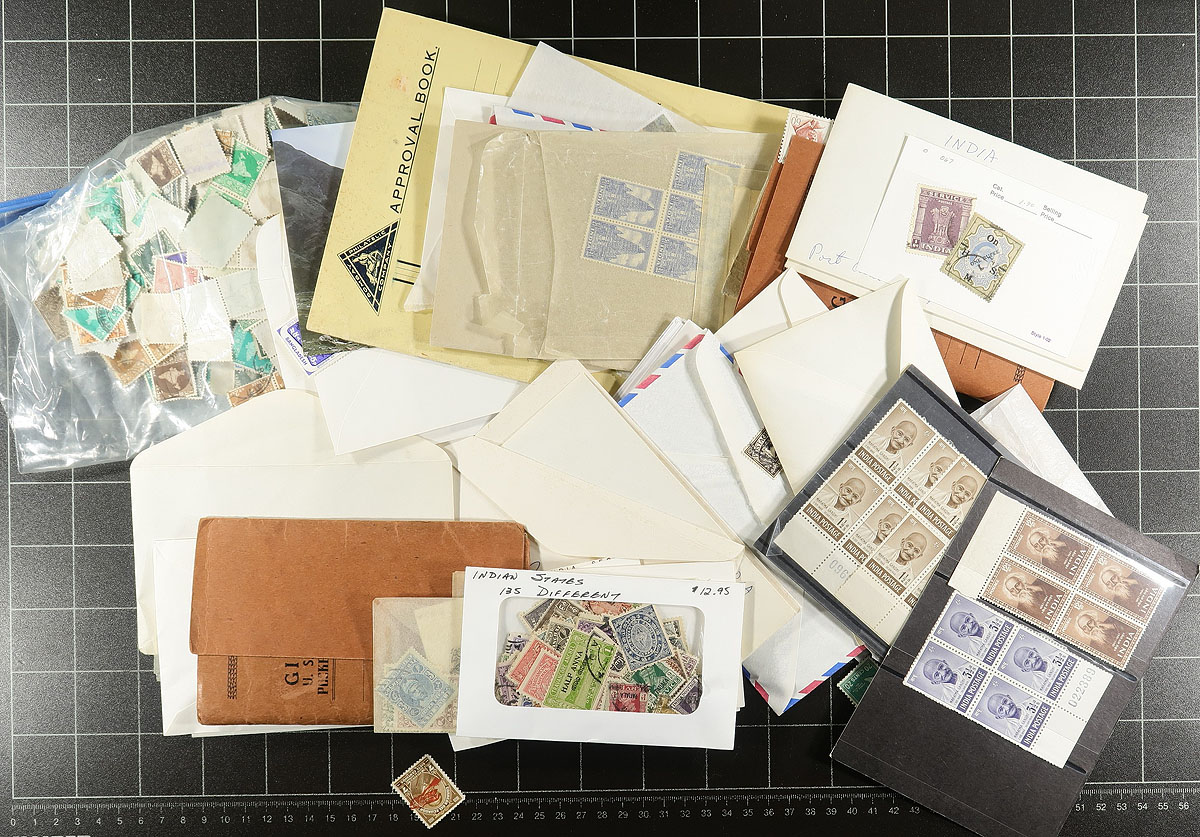 Balance of a consignment in a tin and a bundle of album pages. The tin may be the most valuable part with an assortment of mint and used issues from Queen Victoria to the 1990’s with strength in the 1940’s-1950’s (we noted 14 mint copies of Gandhi #203 and 4 of #204), with bits and pieces of definitives and "Asian Games 1951" plus more. There are old block files, approval booklets, envelopes with loose stamps, etc. There is an envelope with a folded and a bit battered sheet of #155. The album pages cover "India - adjacent" countries on Minkus pages, from Burma, Pakistan, Nepal and Ceylon - almost all pre-1970, with a few hundred mostly used stamps with individual catalog values up to $10.00. A philatelic miner’s delight. Estimate =