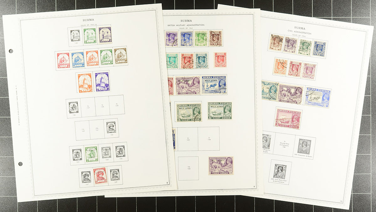Balance of a consignment in a tin and a bundle of album pages. The tin may be the most valuable part with an assortment of mint and used issues from Queen Victoria to the 1990’s with strength in the 1940’s-1950’s (we noted 14 mint copies of Gandhi #203 and 4 of #204), with bits and pieces of definitives and "Asian Games 1951" plus more. There are old block files, approval booklets, envelopes with loose stamps, etc. There is an envelope with a folded and a bit battered sheet of #155. The album pages cover "India - adjacent" countries on Minkus pages, from Burma, Pakistan, Nepal and Ceylon - almost all pre-1970, with a few hundred mostly used stamps with individual catalog values up to $10.00. A philatelic miner’s delight. Estimate =