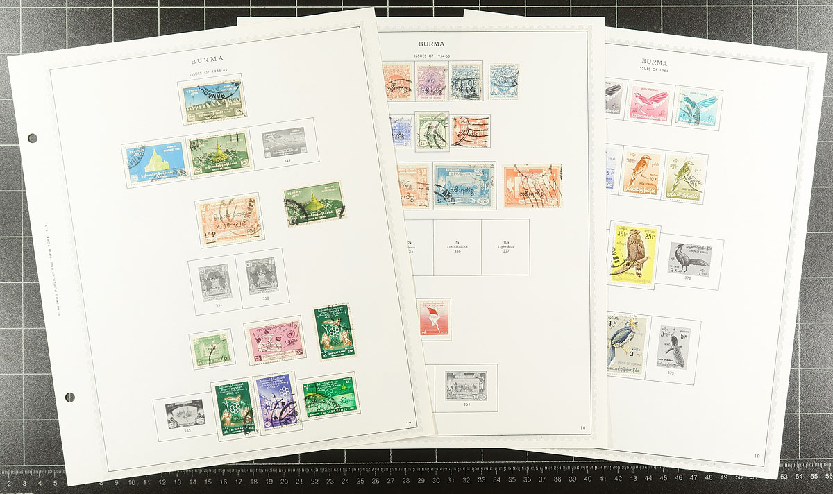 Balance of a consignment in a tin and a bundle of album pages. The tin may be the most valuable part with an assortment of mint and used issues from Queen Victoria to the 1990’s with strength in the 1940’s-1950’s (we noted 14 mint copies of Gandhi #203 and 4 of #204), with bits and pieces of definitives and "Asian Games 1951" plus more. There are old block files, approval booklets, envelopes with loose stamps, etc. There is an envelope with a folded and a bit battered sheet of #155. The album pages cover "India - adjacent" countries on Minkus pages, from Burma, Pakistan, Nepal and Ceylon - almost all pre-1970, with a few hundred mostly used stamps with individual catalog values up to $10.00. A philatelic miner’s delight. Estimate =