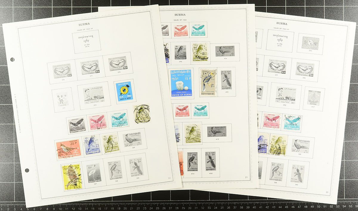Balance of a consignment in a tin and a bundle of album pages. The tin may be the most valuable part with an assortment of mint and used issues from Queen Victoria to the 1990’s with strength in the 1940’s-1950’s (we noted 14 mint copies of Gandhi #203 and 4 of #204), with bits and pieces of definitives and "Asian Games 1951" plus more. There are old block files, approval booklets, envelopes with loose stamps, etc. There is an envelope with a folded and a bit battered sheet of #155. The album pages cover "India - adjacent" countries on Minkus pages, from Burma, Pakistan, Nepal and Ceylon - almost all pre-1970, with a few hundred mostly used stamps with individual catalog values up to $10.00. A philatelic miner’s delight. Estimate =