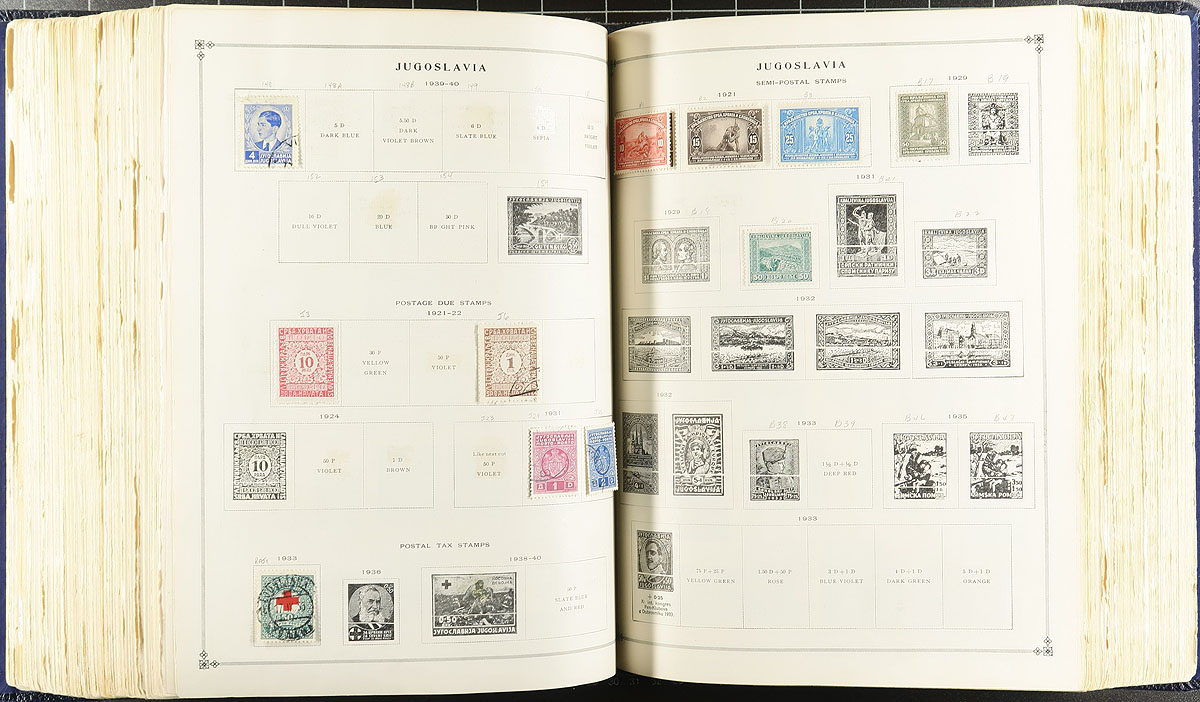 Scott International Album Part 1 (pages up to 1940), loaded with a few thousand, mostly used, stamps from all over with strength in Europe, South America, British Colonies with some Asia and Africa plus more. Most of the stamps are relatively common but did notice better such as a Canada "Bluenose" stamp, and scattered others of up to $10.00 catalogue value. Lot of nice cancels and much better condition than normally seen. If you love classic, engraved stamps, this collection is for you. The album is complete, with the exception of the US pages, and the binder is intact, but starting to split (These albums are still in print after 78 years but will set you back almost $1000 as new)! The estimate is based on the stamps only. Estimate =
