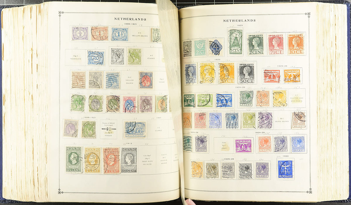 Scott International Album Part 1 (pages up to 1940), loaded with a few thousand, mostly used, stamps from all over with strength in Europe, South America, British Colonies with some Asia and Africa plus more. Most of the stamps are relatively common but did notice better such as a Canada "Bluenose" stamp, and scattered others of up to $10.00 catalogue value. Lot of nice cancels and much better condition than normally seen. If you love classic, engraved stamps, this collection is for you. The album is complete, with the exception of the US pages, and the binder is intact, but starting to split (These albums are still in print after 78 years but will set you back almost $1000 as new)! The estimate is based on the stamps only. Estimate =