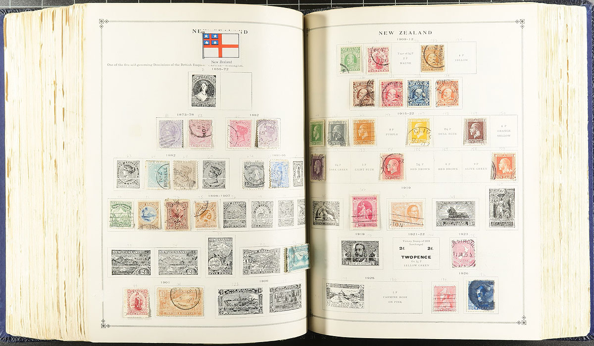 Scott International Album Part 1 (pages up to 1940), loaded with a few thousand, mostly used, stamps from all over with strength in Europe, South America, British Colonies with some Asia and Africa plus more. Most of the stamps are relatively common but did notice better such as a Canada "Bluenose" stamp, and scattered others of up to $10.00 catalogue value. Lot of nice cancels and much better condition than normally seen. If you love classic, engraved stamps, this collection is for you. The album is complete, with the exception of the US pages, and the binder is intact, but starting to split (These albums are still in print after 78 years but will set you back almost $1000 as new)! The estimate is based on the stamps only. Estimate =