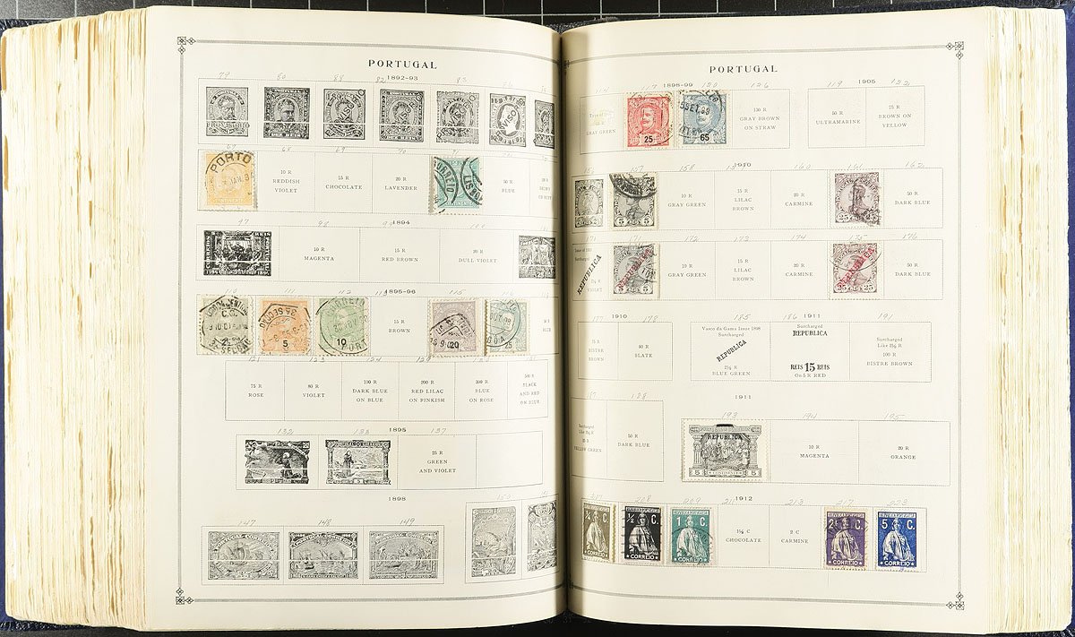 Scott International Album Part 1 (pages up to 1940), loaded with a few thousand, mostly used, stamps from all over with strength in Europe, South America, British Colonies with some Asia and Africa plus more. Most of the stamps are relatively common but did notice better such as a Canada "Bluenose" stamp, and scattered others of up to $10.00 catalogue value. Lot of nice cancels and much better condition than normally seen. If you love classic, engraved stamps, this collection is for you. The album is complete, with the exception of the US pages, and the binder is intact, but starting to split (These albums are still in print after 78 years but will set you back almost $1000 as new)! The estimate is based on the stamps only. Estimate =