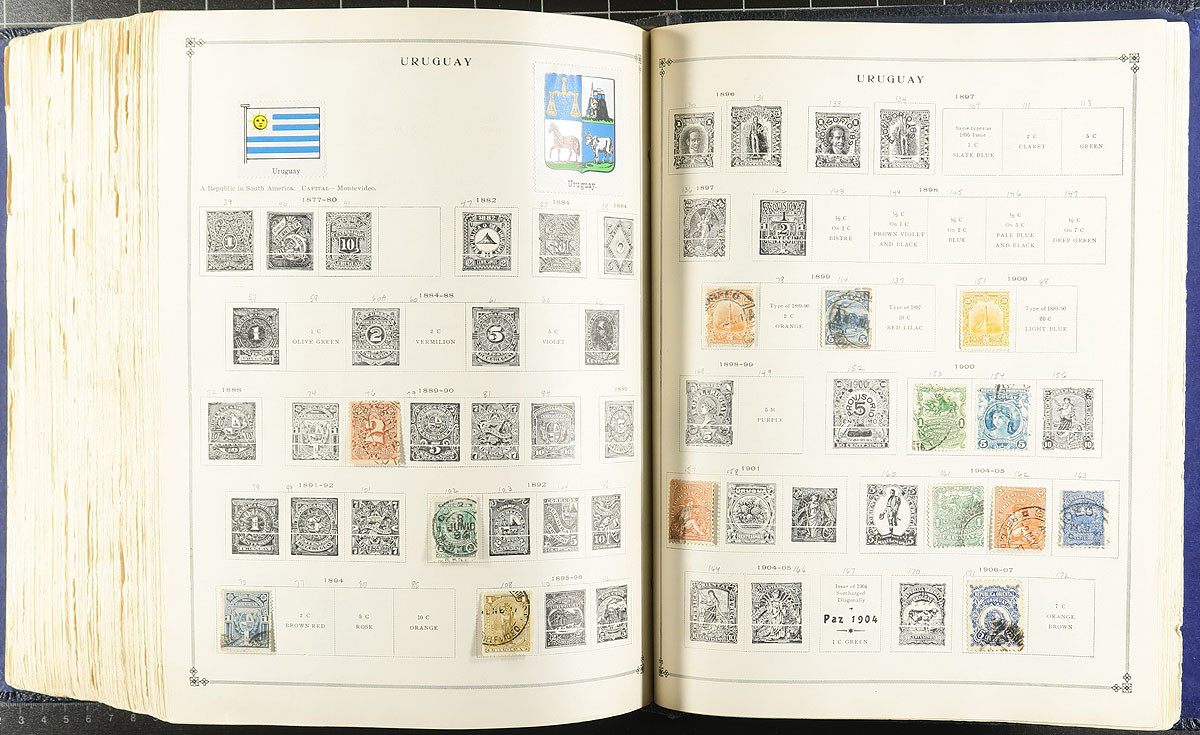 Scott International Album Part 1 (pages up to 1940), loaded with a few thousand, mostly used, stamps from all over with strength in Europe, South America, British Colonies with some Asia and Africa plus more. Most of the stamps are relatively common but did notice better such as a Canada "Bluenose" stamp, and scattered others of up to $10.00 catalogue value. Lot of nice cancels and much better condition than normally seen. If you love classic, engraved stamps, this collection is for you. The album is complete, with the exception of the US pages, and the binder is intact, but starting to split (These albums are still in print after 78 years but will set you back almost $1000 as new)! The estimate is based on the stamps only. Estimate =