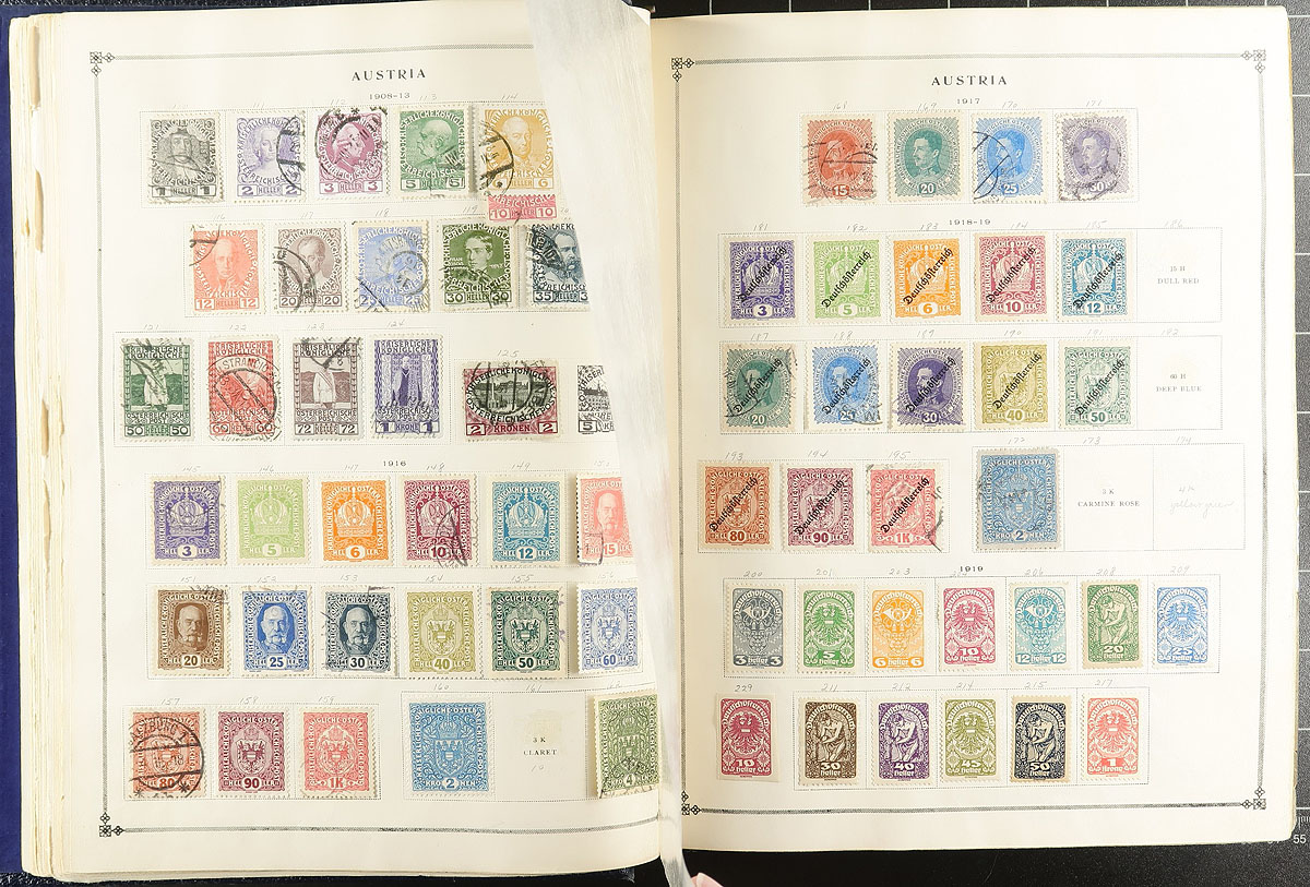 Scott International Album Part 1 (pages up to 1940), loaded with a few thousand, mostly used, stamps from all over with strength in Europe, South America, British Colonies with some Asia and Africa plus more. Most of the stamps are relatively common but did notice better such as a Canada "Bluenose" stamp, and scattered others of up to $10.00 catalogue value. Lot of nice cancels and much better condition than normally seen. If you love classic, engraved stamps, this collection is for you. The album is complete, with the exception of the US pages, and the binder is intact, but starting to split (These albums are still in print after 78 years but will set you back almost $1000 as new)! The estimate is based on the stamps only. Estimate =