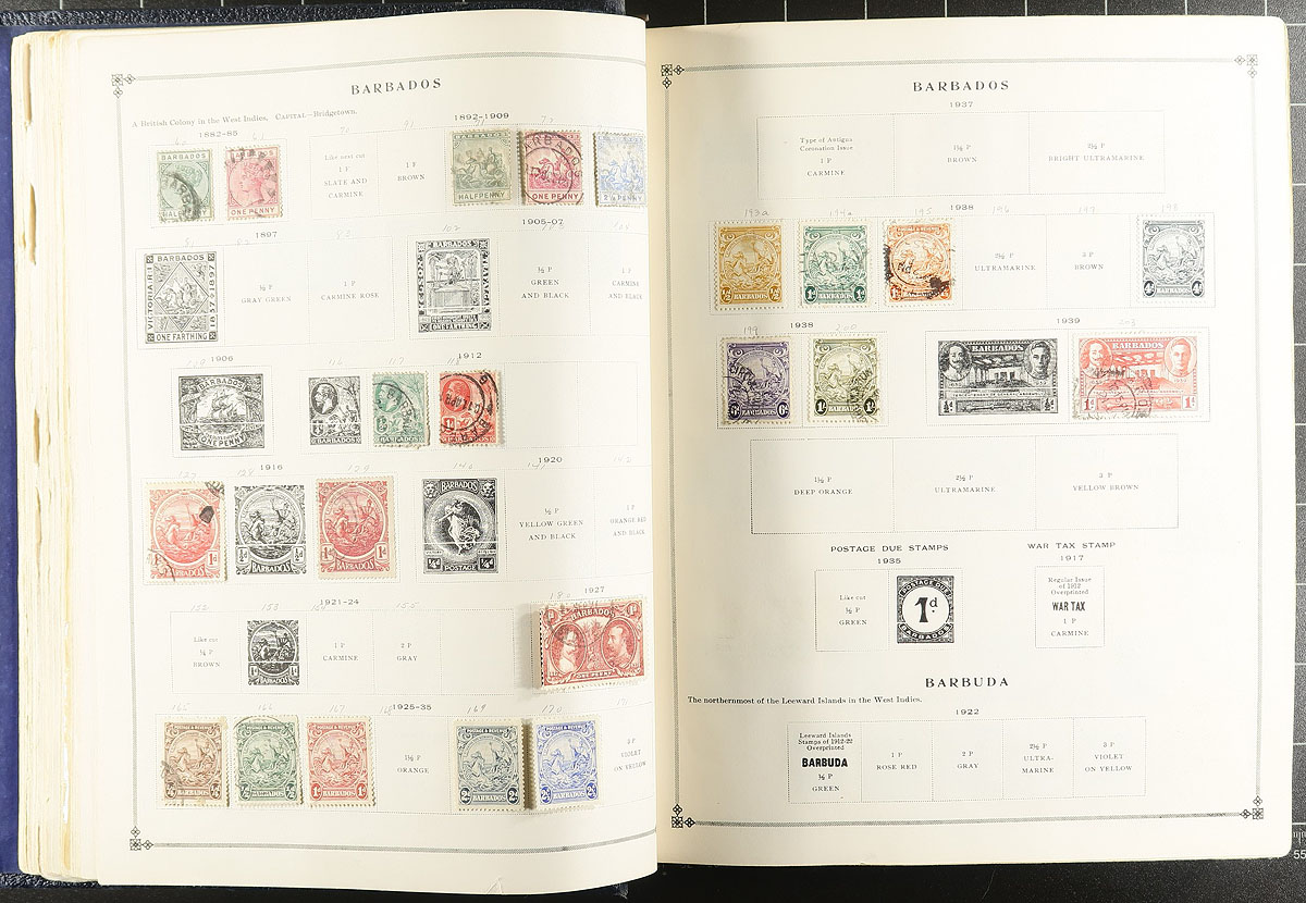 Scott International Album Part 1 (pages up to 1940), loaded with a few thousand, mostly used, stamps from all over with strength in Europe, South America, British Colonies with some Asia and Africa plus more. Most of the stamps are relatively common but did notice better such as a Canada "Bluenose" stamp, and scattered others of up to $10.00 catalogue value. Lot of nice cancels and much better condition than normally seen. If you love classic, engraved stamps, this collection is for you. The album is complete, with the exception of the US pages, and the binder is intact, but starting to split (These albums are still in print after 78 years but will set you back almost $1000 as new)! The estimate is based on the stamps only. Estimate =