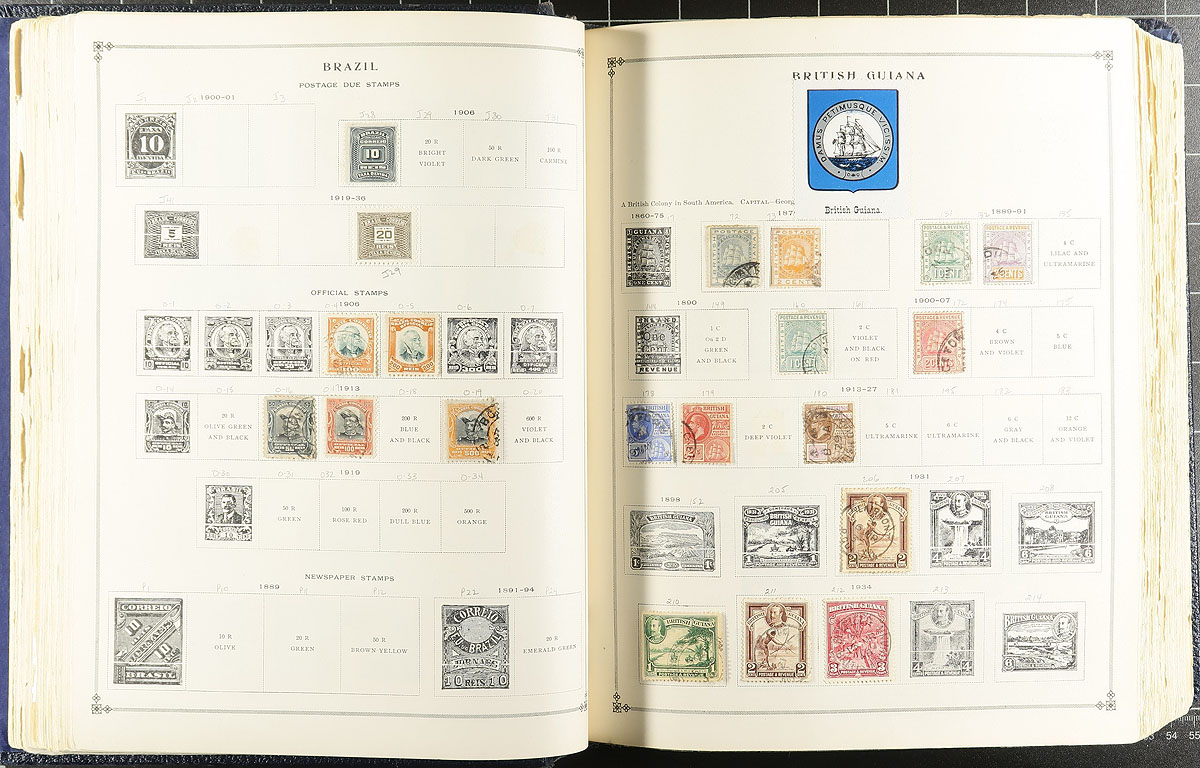 Scott International Album Part 1 (pages up to 1940), loaded with a few thousand, mostly used, stamps from all over with strength in Europe, South America, British Colonies with some Asia and Africa plus more. Most of the stamps are relatively common but did notice better such as a Canada "Bluenose" stamp, and scattered others of up to $10.00 catalogue value. Lot of nice cancels and much better condition than normally seen. If you love classic, engraved stamps, this collection is for you. The album is complete, with the exception of the US pages, and the binder is intact, but starting to split (These albums are still in print after 78 years but will set you back almost $1000 as new)! The estimate is based on the stamps only. Estimate =