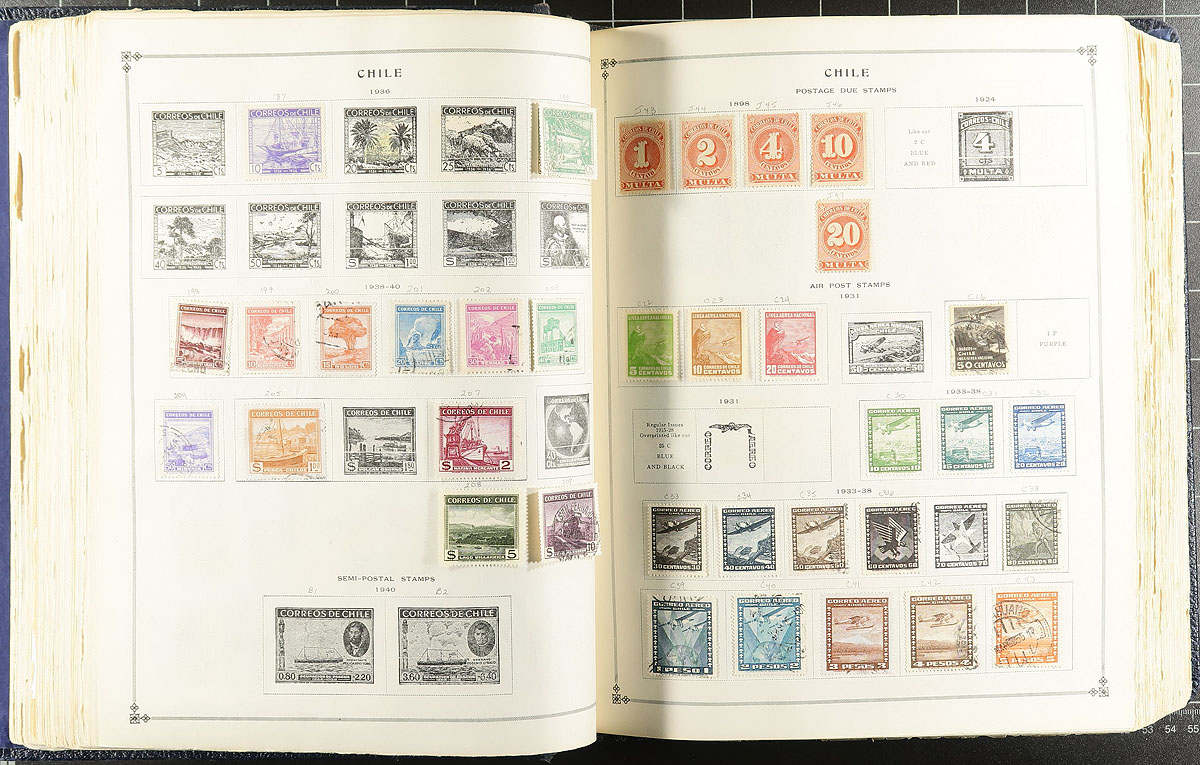 Scott International Album Part 1 (pages up to 1940), loaded with a few thousand, mostly used, stamps from all over with strength in Europe, South America, British Colonies with some Asia and Africa plus more. Most of the stamps are relatively common but did notice better such as a Canada "Bluenose" stamp, and scattered others of up to $10.00 catalogue value. Lot of nice cancels and much better condition than normally seen. If you love classic, engraved stamps, this collection is for you. The album is complete, with the exception of the US pages, and the binder is intact, but starting to split (These albums are still in print after 78 years but will set you back almost $1000 as new)! The estimate is based on the stamps only. Estimate =