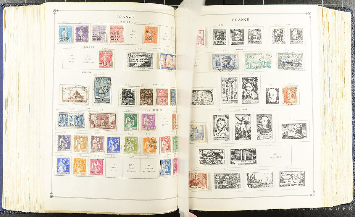 Scott International Album Part 1 (pages up to 1940), loaded with a few thousand, mostly used, stamps from all over with strength in Europe, South America, British Colonies with some Asia and Africa plus more. Most of the stamps are relatively common but did notice better such as a Canada "Bluenose" stamp, and scattered others of up to $10.00 catalogue value. Lot of nice cancels and much better condition than normally seen. If you love classic, engraved stamps, this collection is for you. The album is complete, with the exception of the US pages, and the binder is intact, but starting to split (These albums are still in print after 78 years but will set you back almost $1000 as new)! The estimate is based on the stamps only. Estimate =