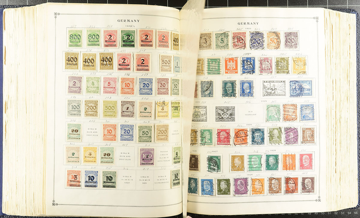 Scott International Album Part 1 (pages up to 1940), loaded with a few thousand, mostly used, stamps from all over with strength in Europe, South America, British Colonies with some Asia and Africa plus more. Most of the stamps are relatively common but did notice better such as a Canada "Bluenose" stamp, and scattered others of up to $10.00 catalogue value. Lot of nice cancels and much better condition than normally seen. If you love classic, engraved stamps, this collection is for you. The album is complete, with the exception of the US pages, and the binder is intact, but starting to split (These albums are still in print after 78 years but will set you back almost $1000 as new)! The estimate is based on the stamps only. Estimate =