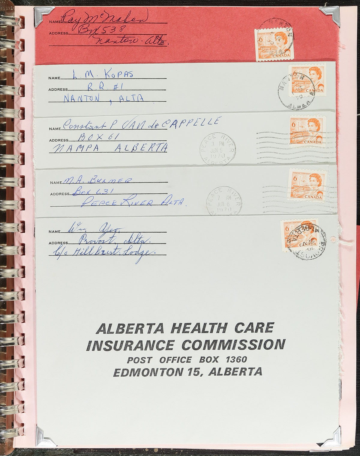 QEII balance of a massive holding (Part 1) of mostly late 1960’s, early 1970’s covers, mostly used within Alberta from a collector fascinated with the use of fluorescent/hi-brite paper. A secondary benefit is that that is a study of rates (particularly Centennial) and obsolete machine and hand cancellations from small Prairie towns. This large tub includes mounted studies of Centennial and contemporary commemoratives (e.g. ILO, Osler), but there is an envelope box and several bundles of roughly separated but not studied covers (often slightly oversized). Expect to put your UV lamp through a workout. Estimate =