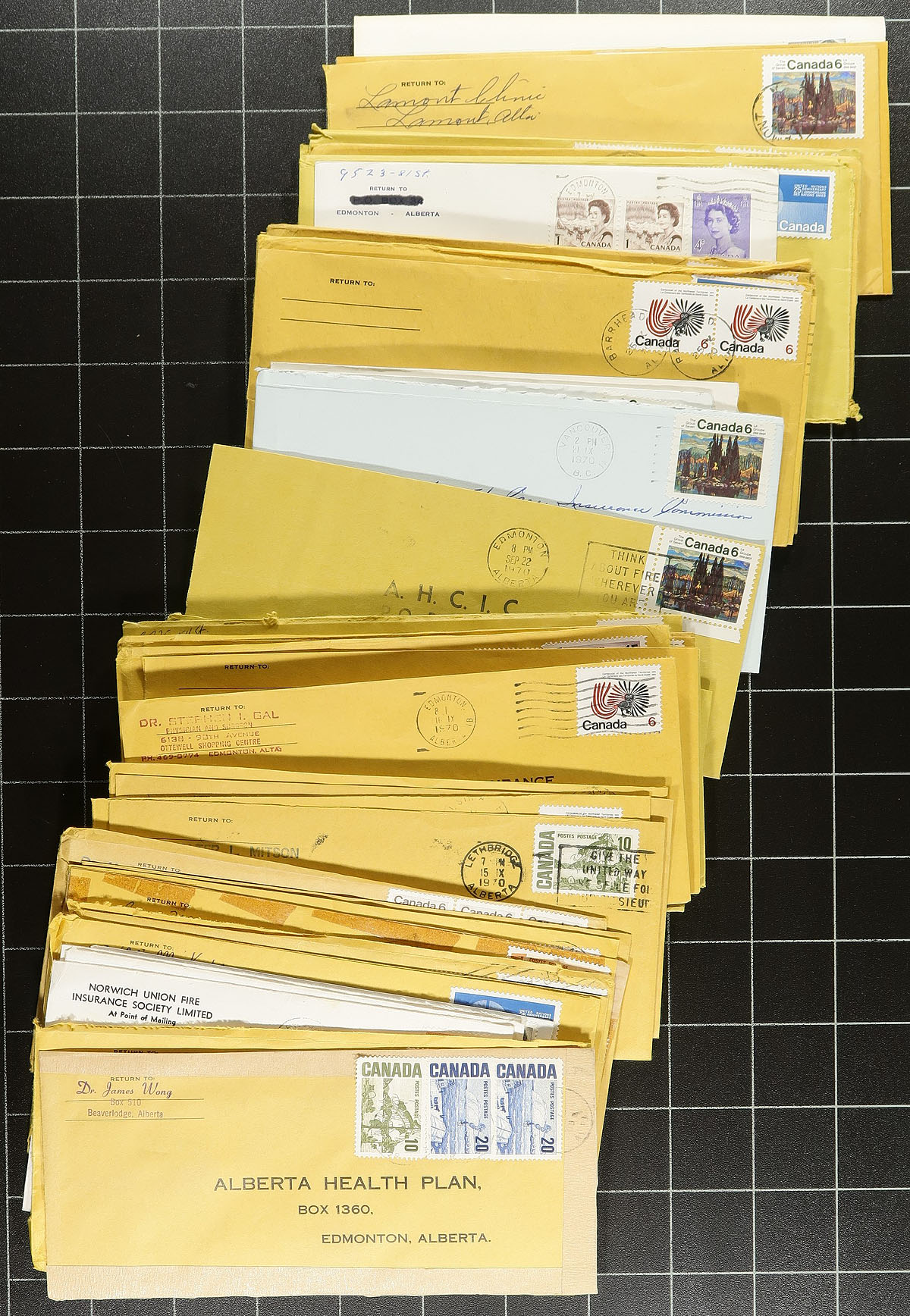 QEII balance of a massive holding (Part 1) of mostly late 1960’s, early 1970’s covers, mostly used within Alberta from a collector fascinated with the use of fluorescent/hi-brite paper. A secondary benefit is that that is a study of rates (particularly Centennial) and obsolete machine and hand cancellations from small Prairie towns. This large tub includes mounted studies of Centennial and contemporary commemoratives (e.g. ILO, Osler), but there is an envelope box and several bundles of roughly separated but not studied covers (often slightly oversized). Expect to put your UV lamp through a workout. Estimate =