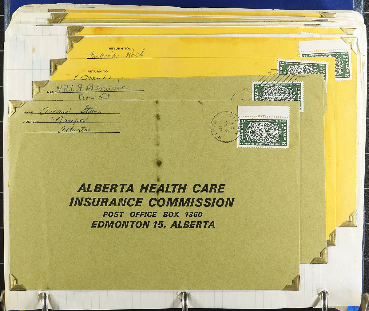QEII balance of a massive holding (Part 1) of mostly late 1960’s, early 1970’s covers, mostly used within Alberta from a collector fascinated with the use of fluorescent/hi-brite paper. A secondary benefit is that that is a study of rates (particularly Centennial) and obsolete machine and hand cancellations from small Prairie towns. This large tub includes mounted studies of Centennial and contemporary commemoratives (e.g. ILO, Osler), but there is an envelope box and several bundles of roughly separated but not studied covers (often slightly oversized). Expect to put your UV lamp through a workout. Estimate =